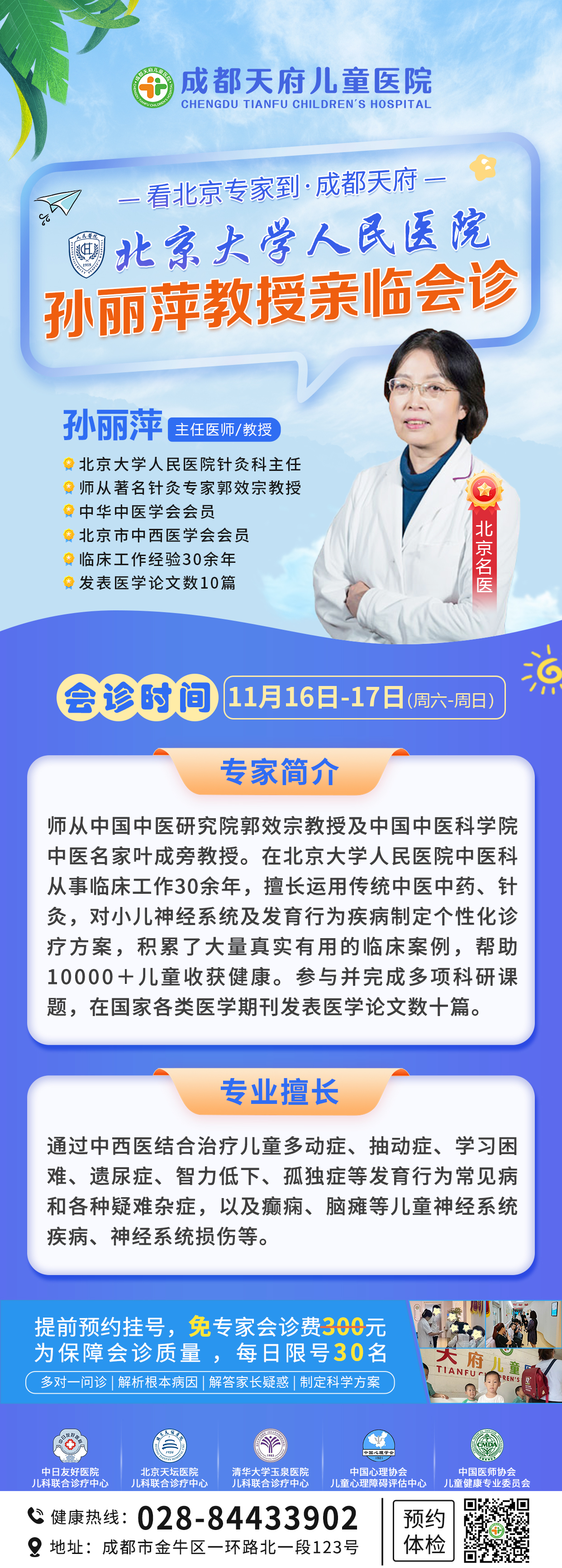 在11月16日至17日的会诊中,孙丽萍教授将与成都天府儿童医院的专家团队紧密合作,共同为前来问诊的小患儿们答疑解惑,诊治疑难杂症,量身定制高效的治疗方案。此次会诊不仅涵盖了儿童生长发育障碍、罕见病、复杂慢性病等多个领域,还将针对一些特殊病历进行深入交流,力求为每一位患儿提供最优质的医疗服务。